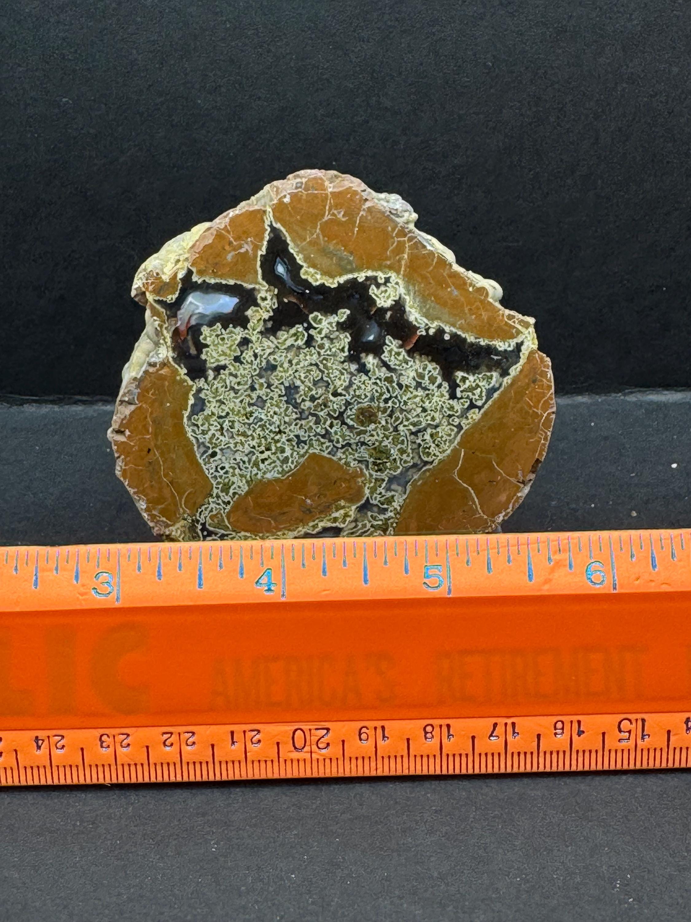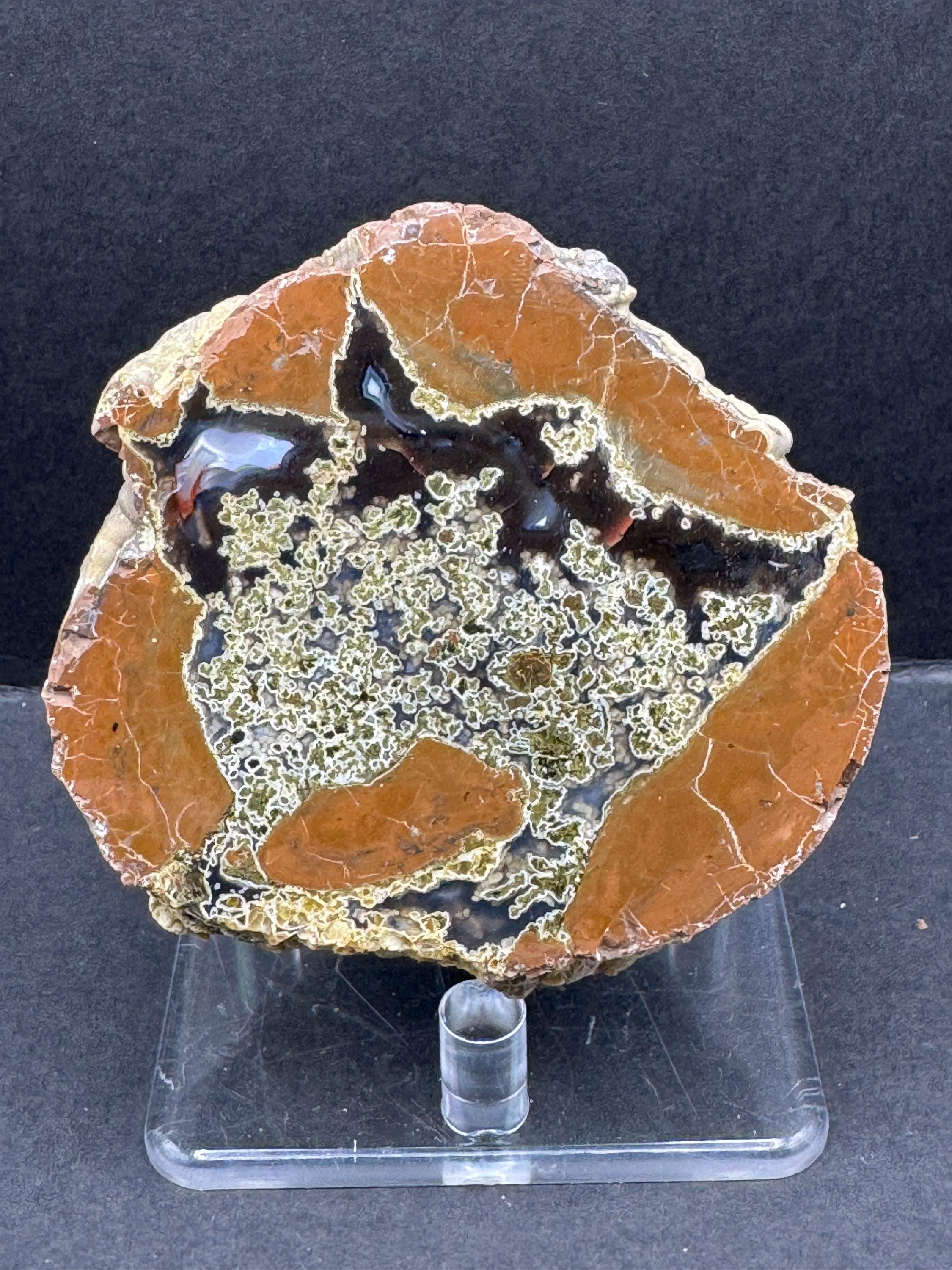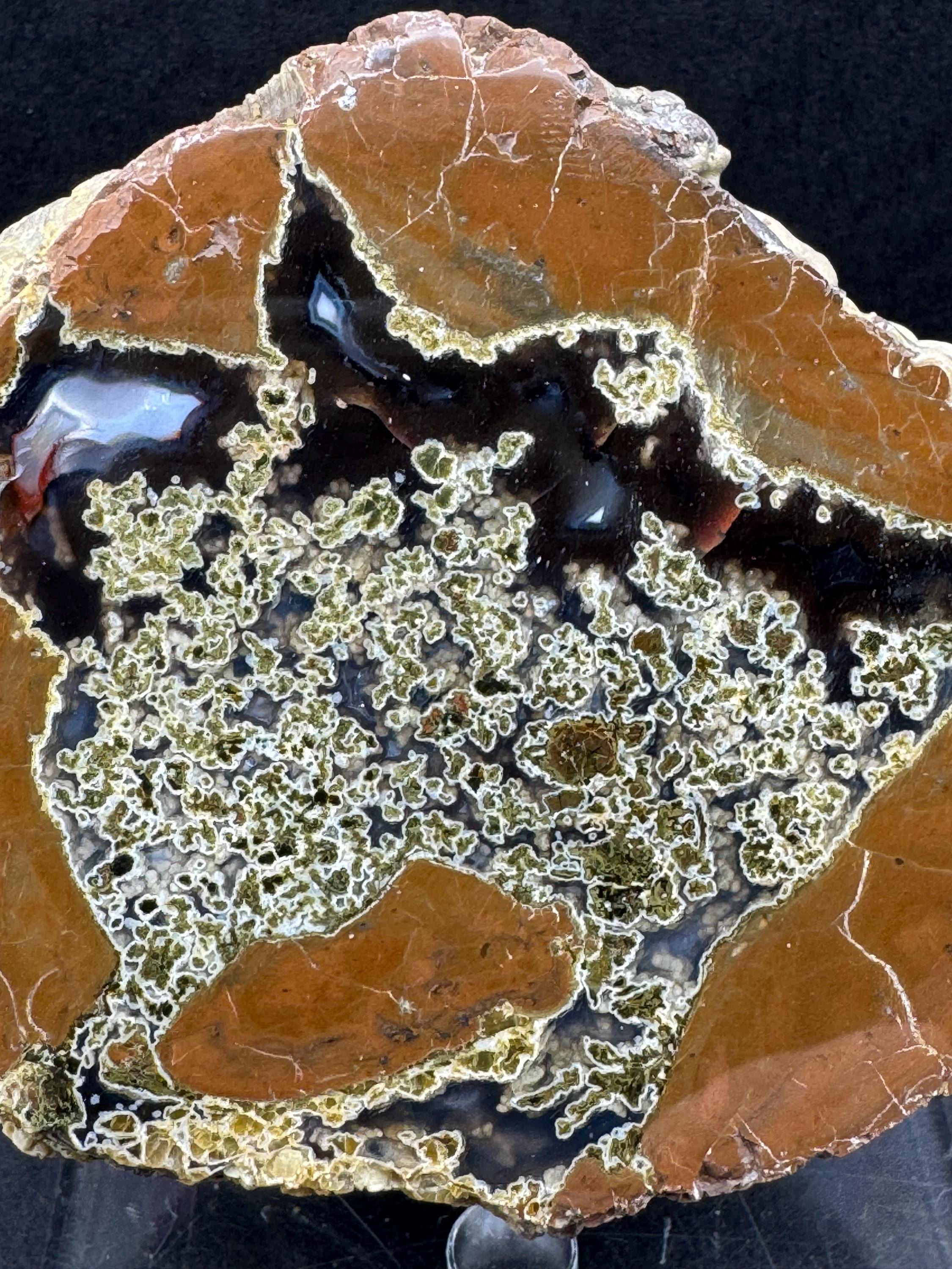 This visually captivating thunderegg from Oregon’s famous Richardson Ranch features deep, dark blue and white chalcedony and a striking mossy pattern throughout. The unique combination of colors and natural textures makes this piece truly one-of-a-kind—an eye-catching addition to any collection or display. Cut and polished to showcase its incredible interior, this egg is a beautiful example of the artistry hidden within the Earth.