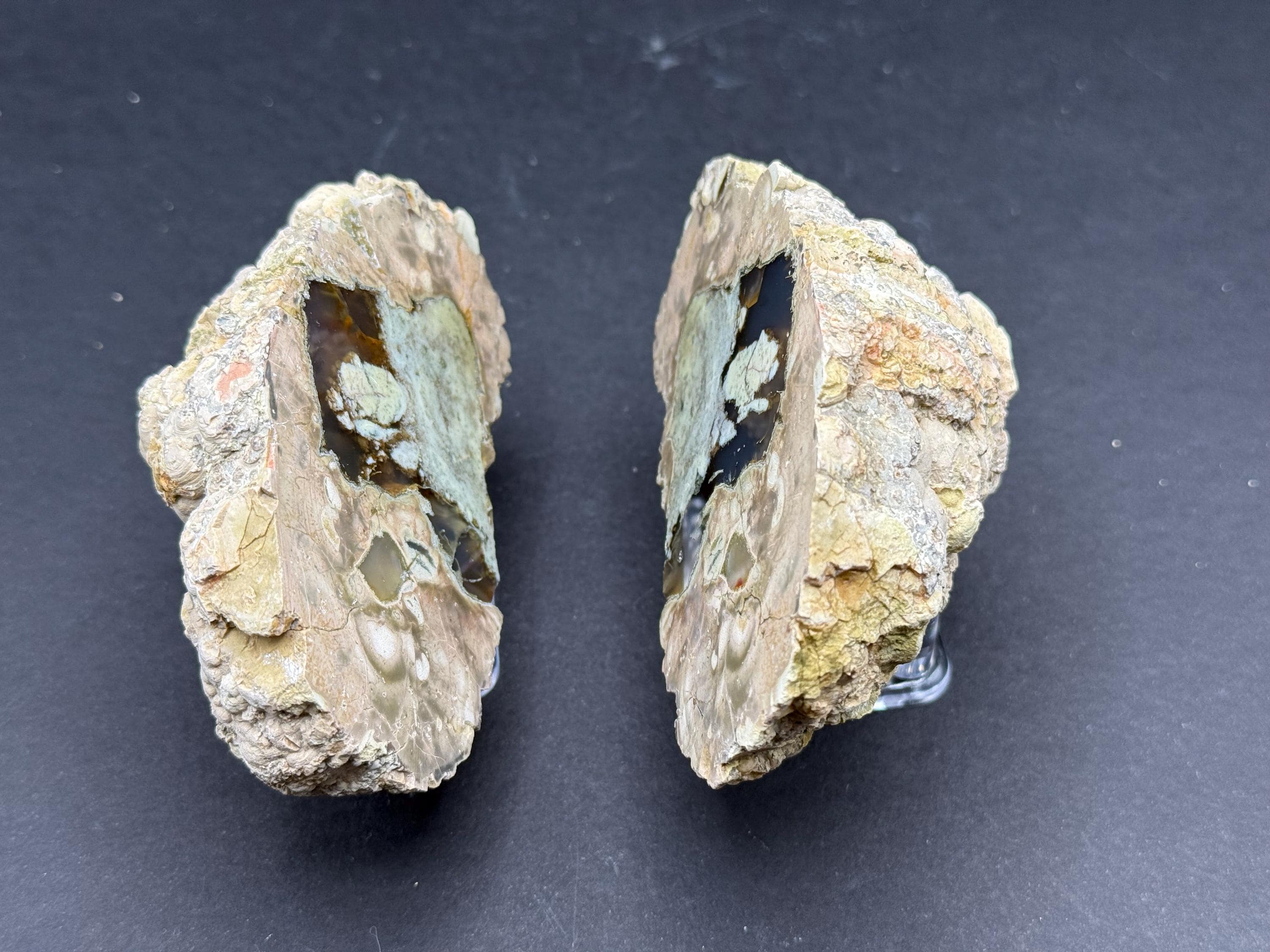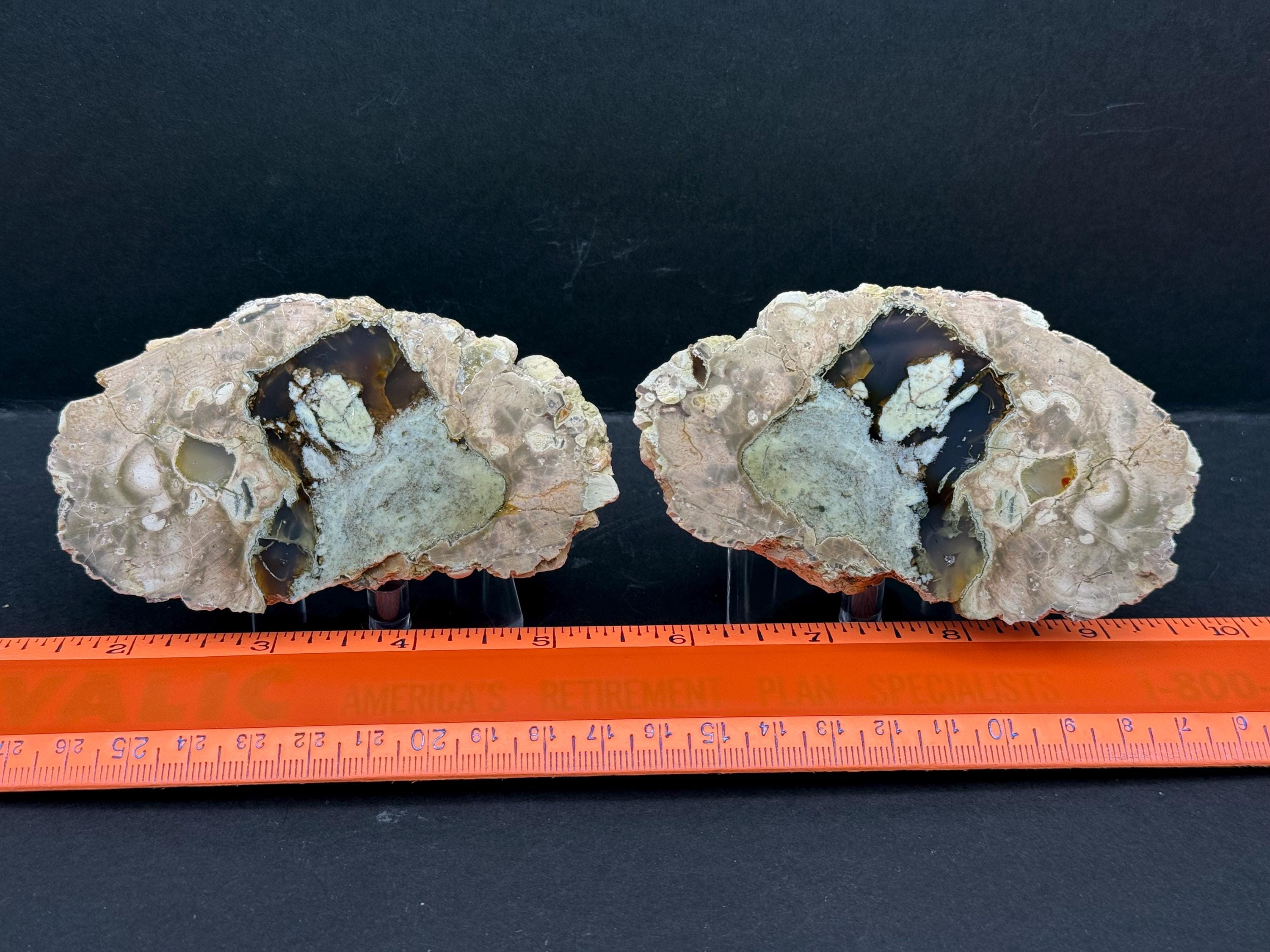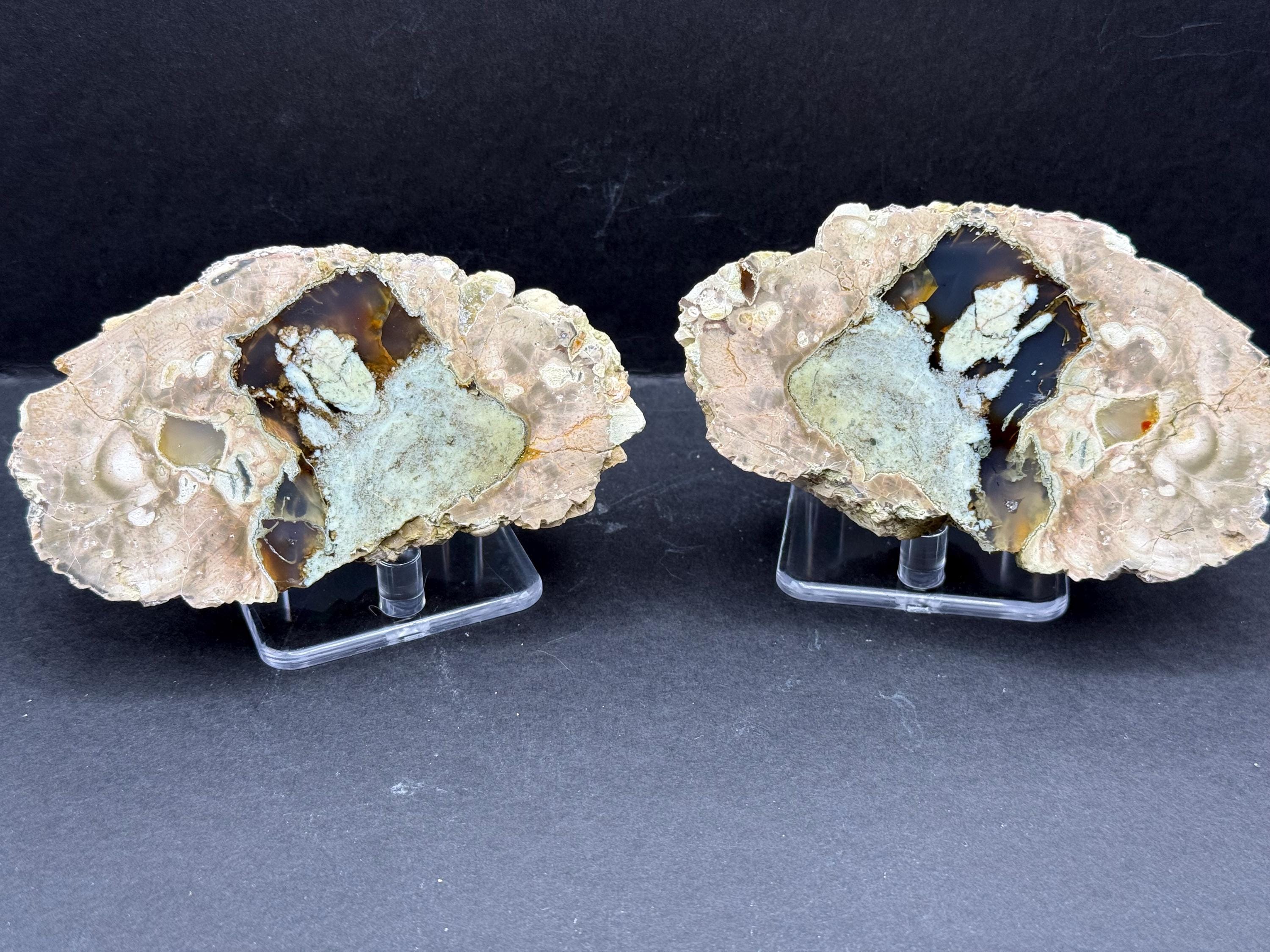 From Oregon’s Radford Bed, this unique thunder egg features warm amber agate beautifully contrasted with what appears to be soft green opal. The Radford site is cherished by collectors for its earthy tones and gentle color transitions, often revealing serene, nature-inspired palettes unlike any other bed in the region.