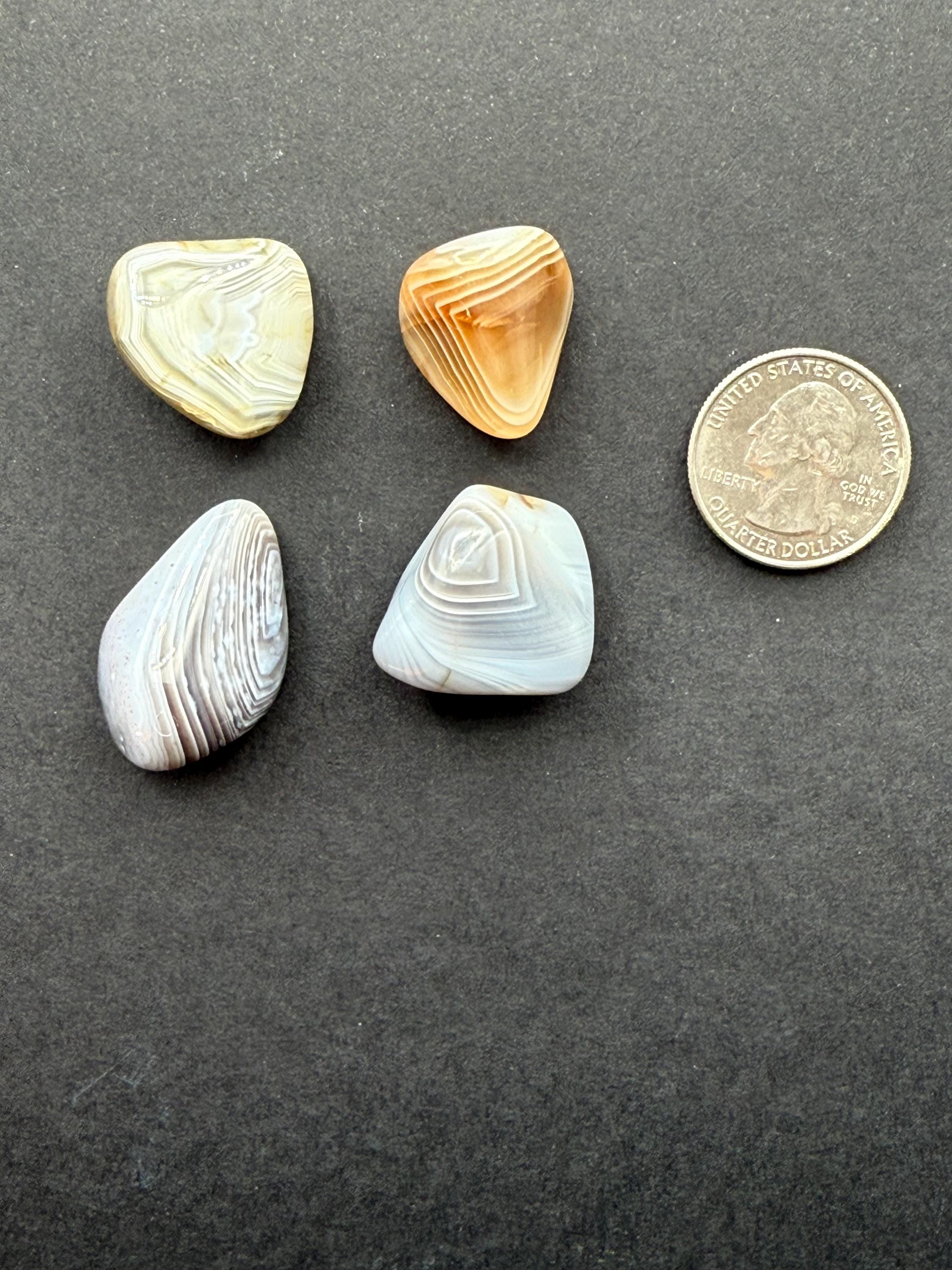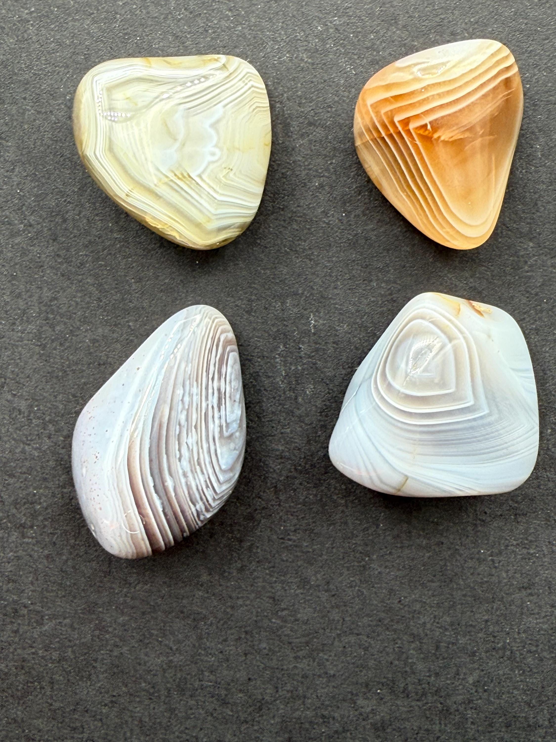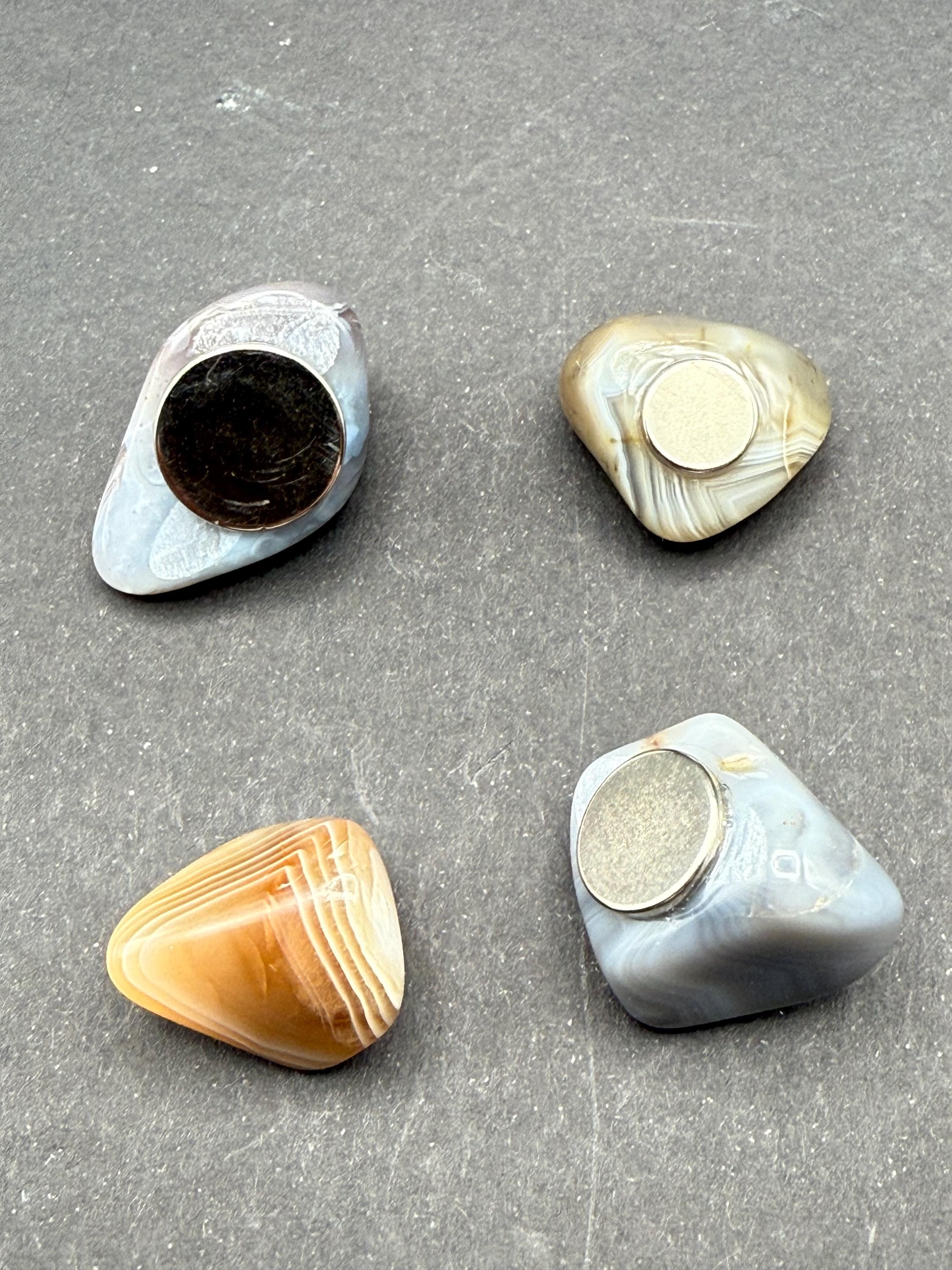 Add a touch of nature’s beauty to your home with this set of four tumbled Botswana Agate magnets. Each stone is tumbled to a smooth polish, revealing its unique banding and color, no two are alike. The stones are securely attached to strong rare earth magnets, making them both beautiful and functional. A perfect gift for rock lovers or anyone who enjoys natural, handcrafted décor.