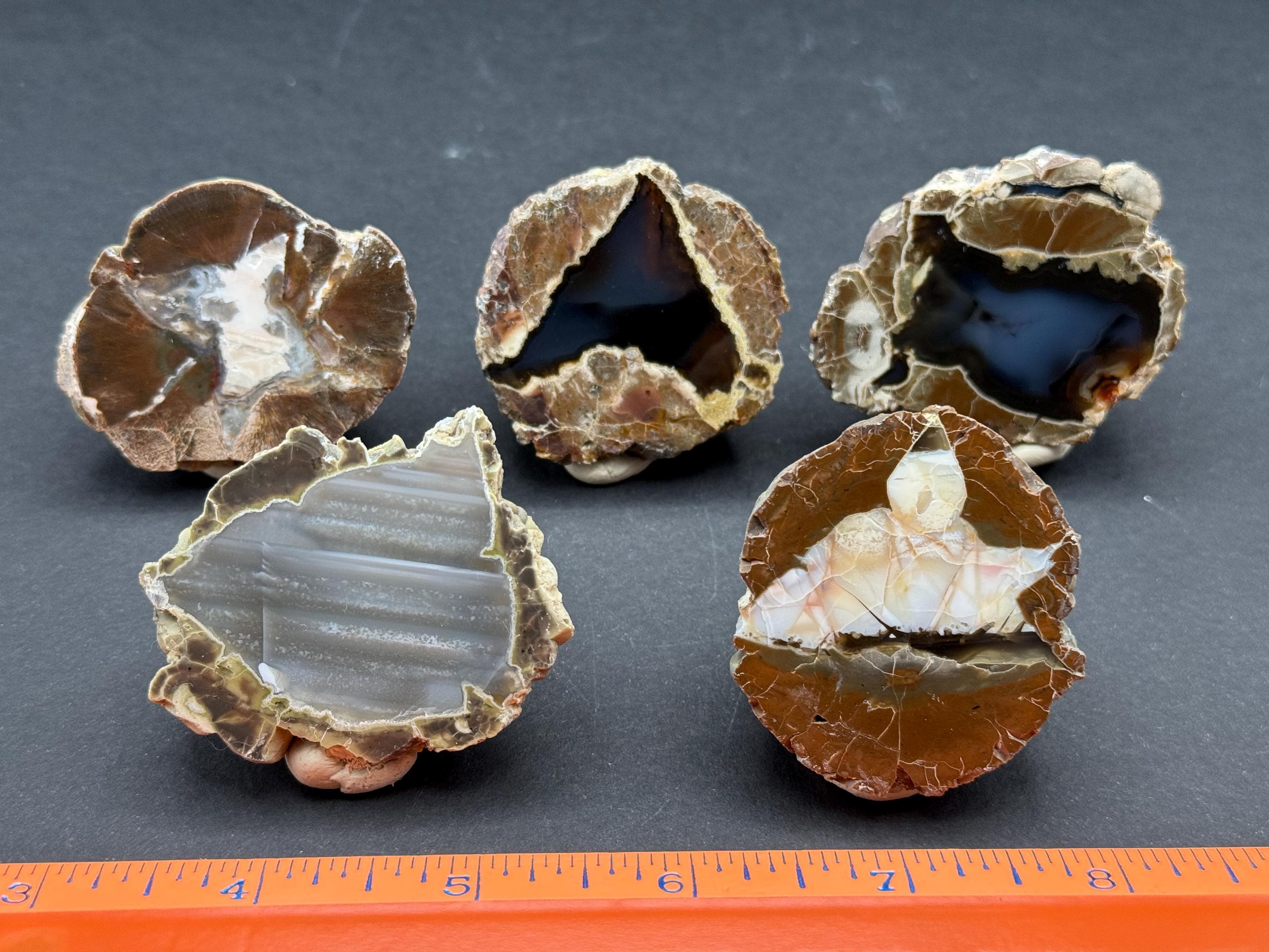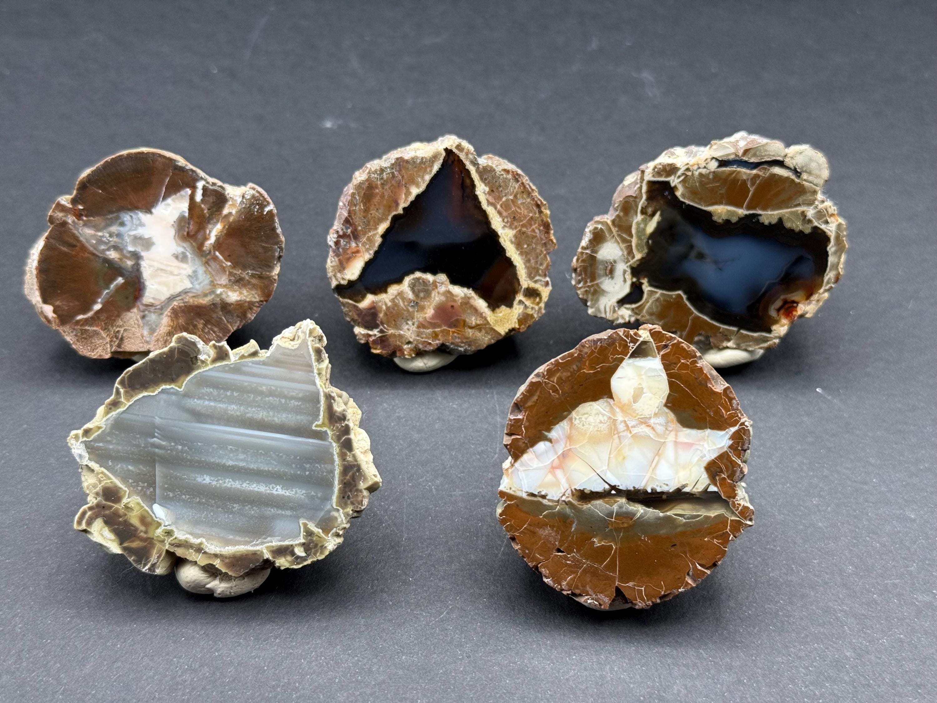 This curated set of 5 Oregon thundereggs is a perfect showcase of the incredible variety of colors, patterns, and textures that make Oregon eggs so special. Each piece comes from a different well-known bed, offering a beautiful sampling for collectors and rock lovers alike.