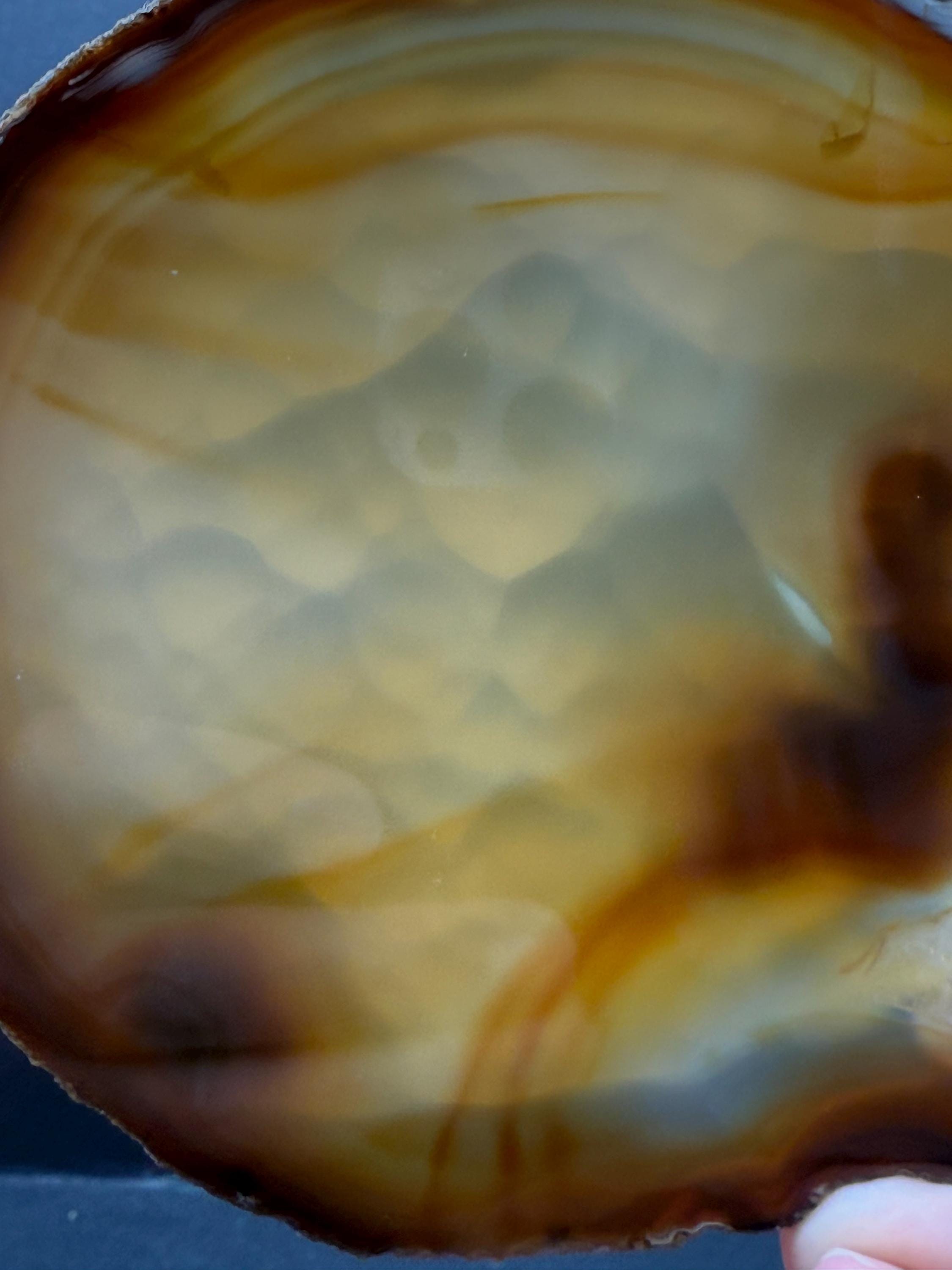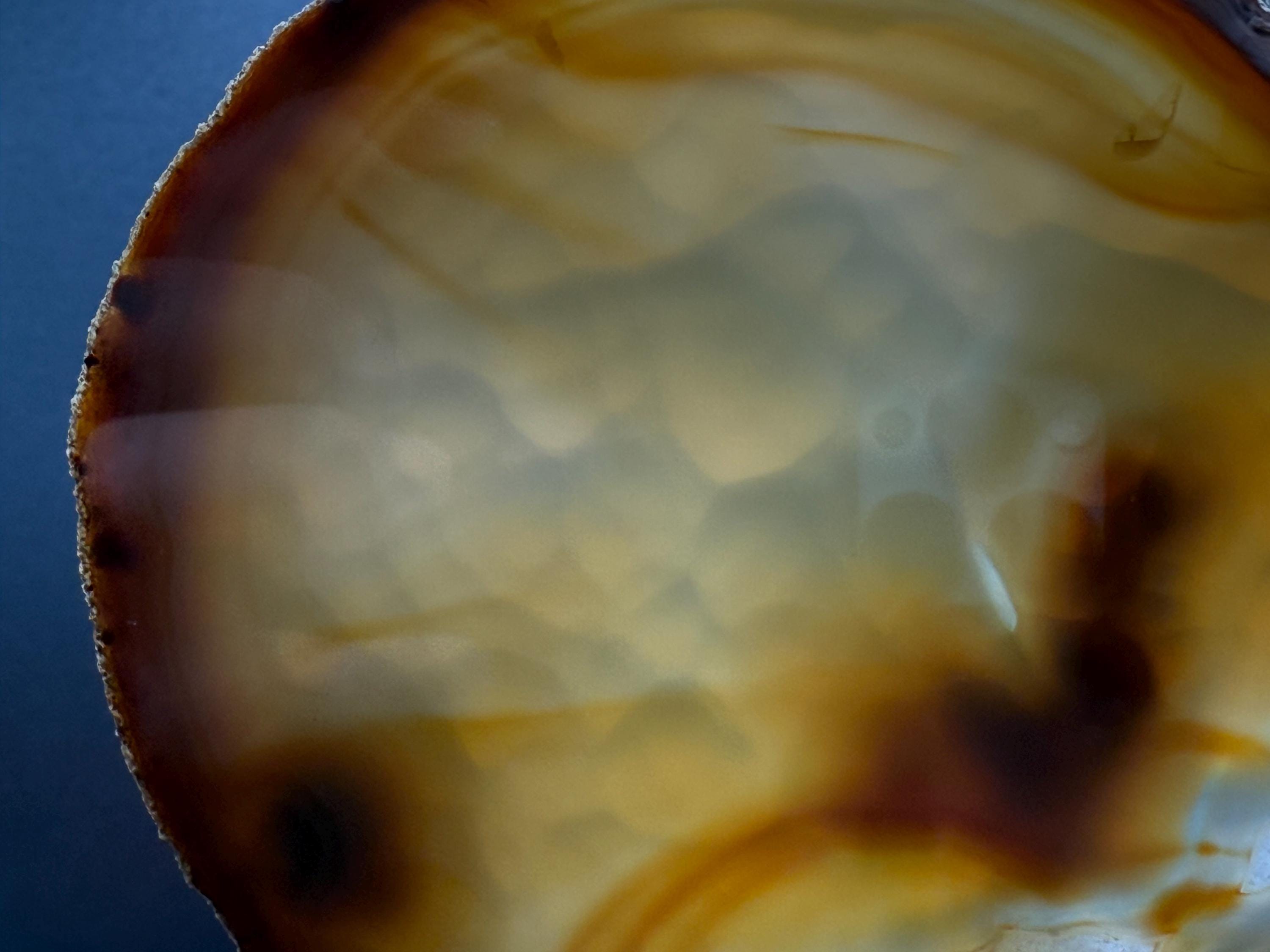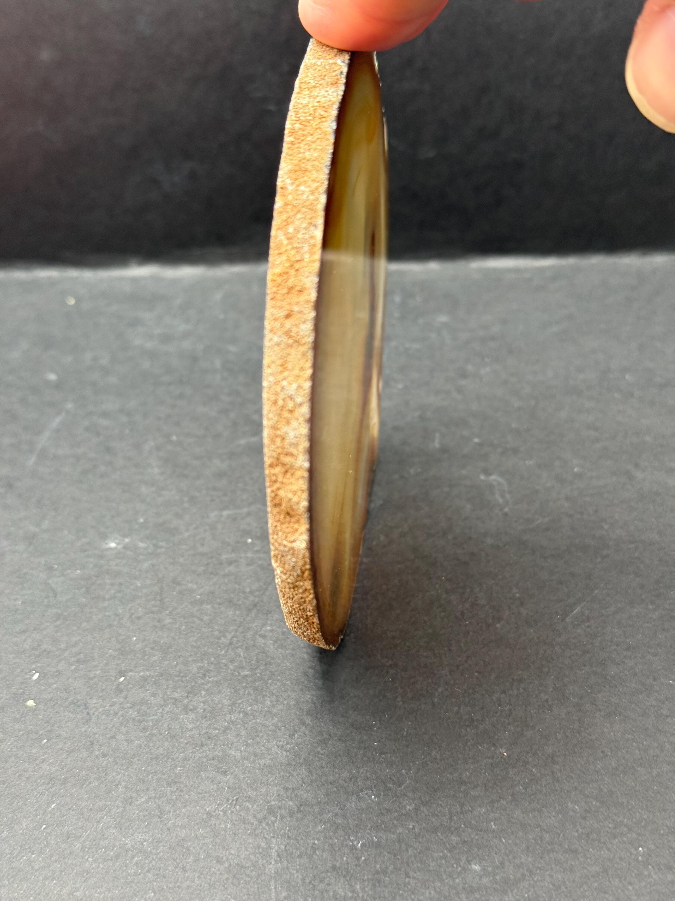 This beautiful Brazilian agate slab features striking turtleback patterning with flowing amber ribbons that glow when the light shines through. The natural translucency makes it a stunning piece to place on a windowsill, light stand, or display shelf, where the colors come alive in warm, earthy tones.