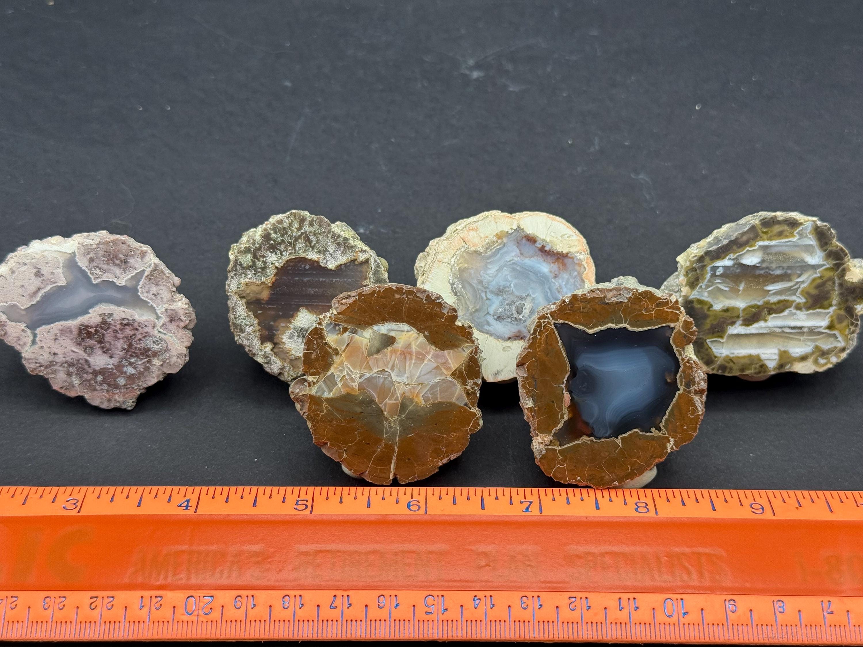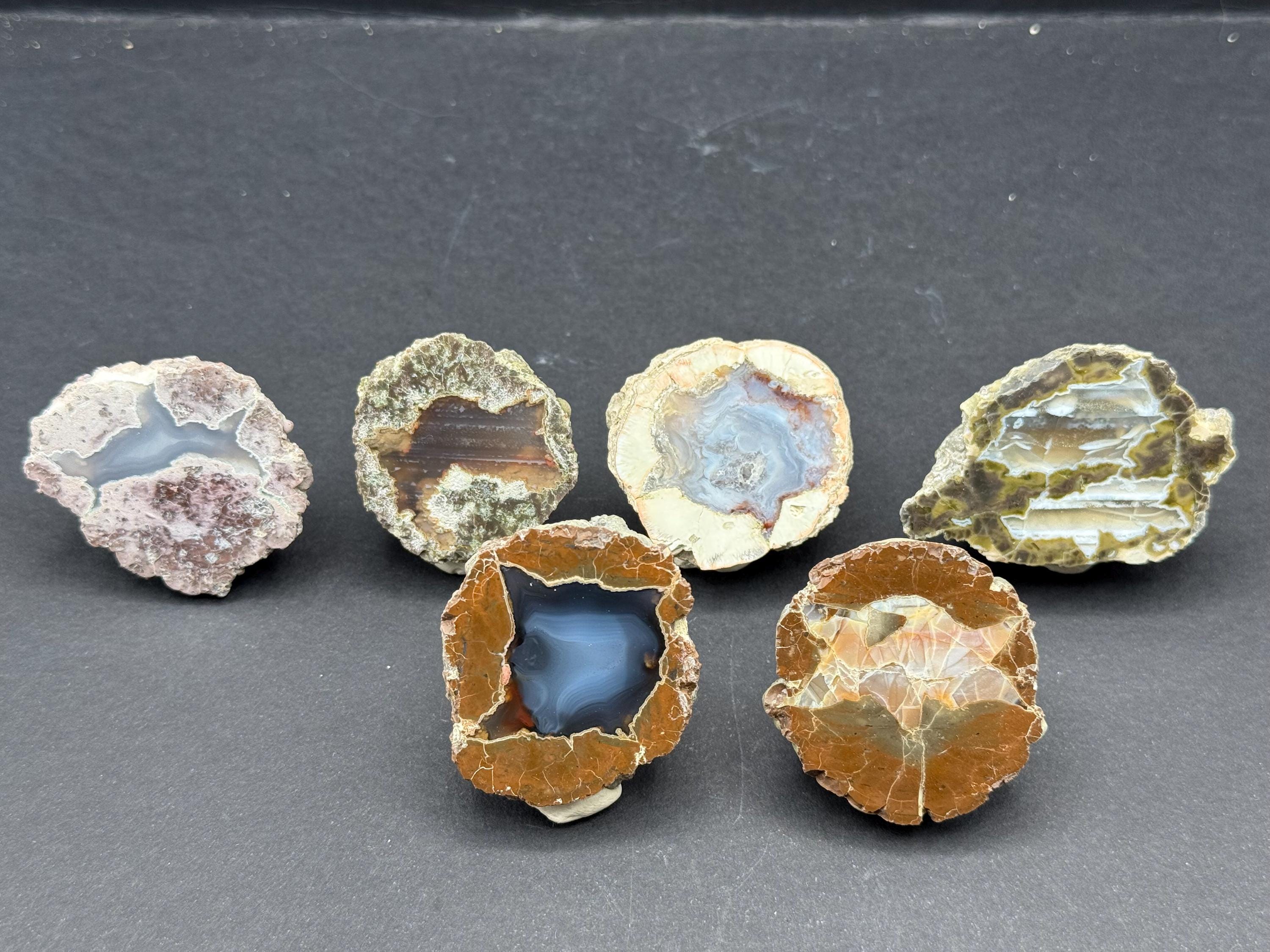 Included in this set: • Secret Ridge — Tan/Gray agate with white opal lines • Richardson’s Ranch — Both a classic blue thunderegg with a bit of red and a second opal egg from the opal beds at Richardson. • Lucky Strike — features a green outer shell paired with a glowing amber agate interior. • Buchanan — Bold white shell with dramatic agate center • Succor Creek — earthy, rugged shell around gray/blue core