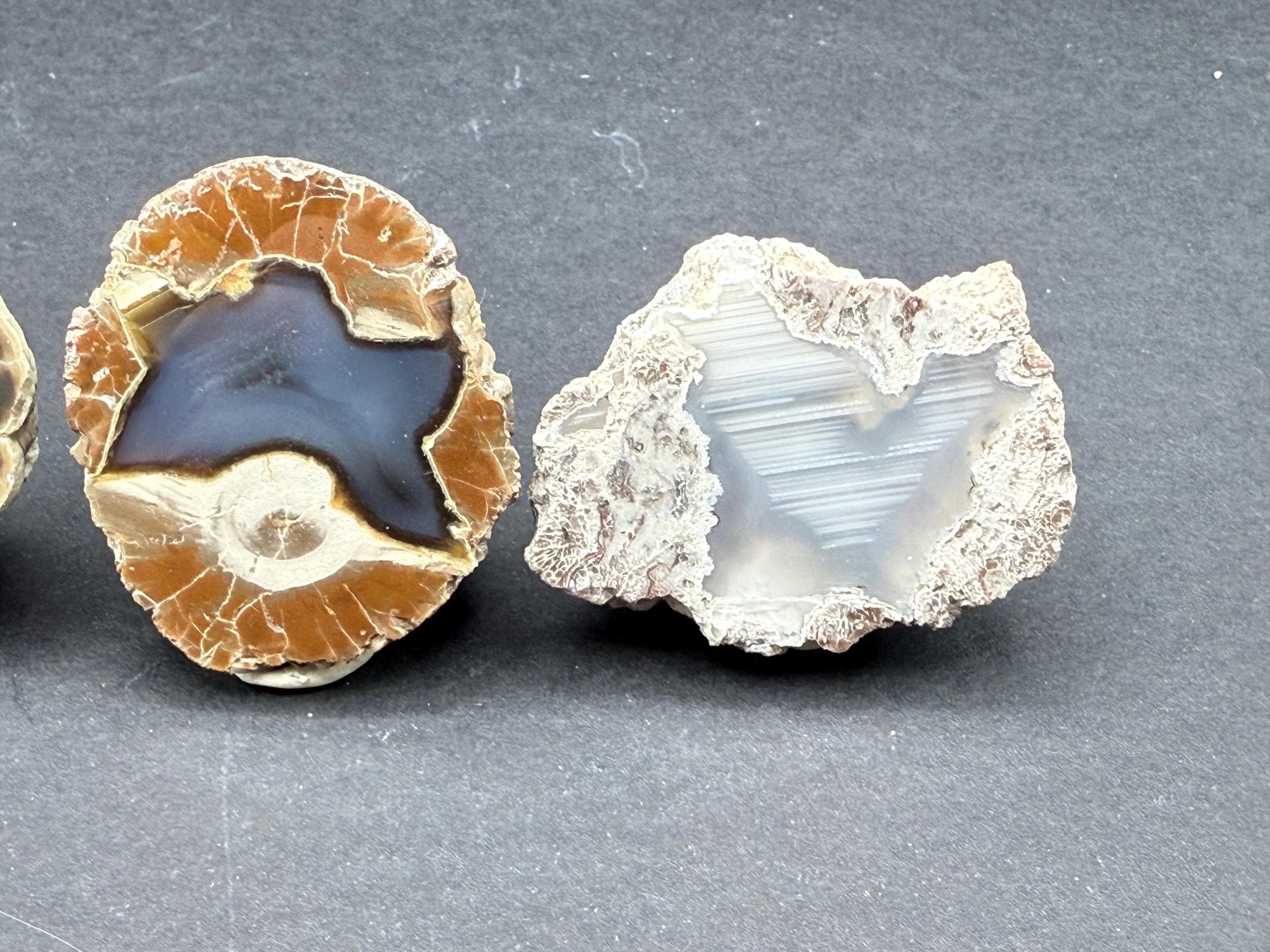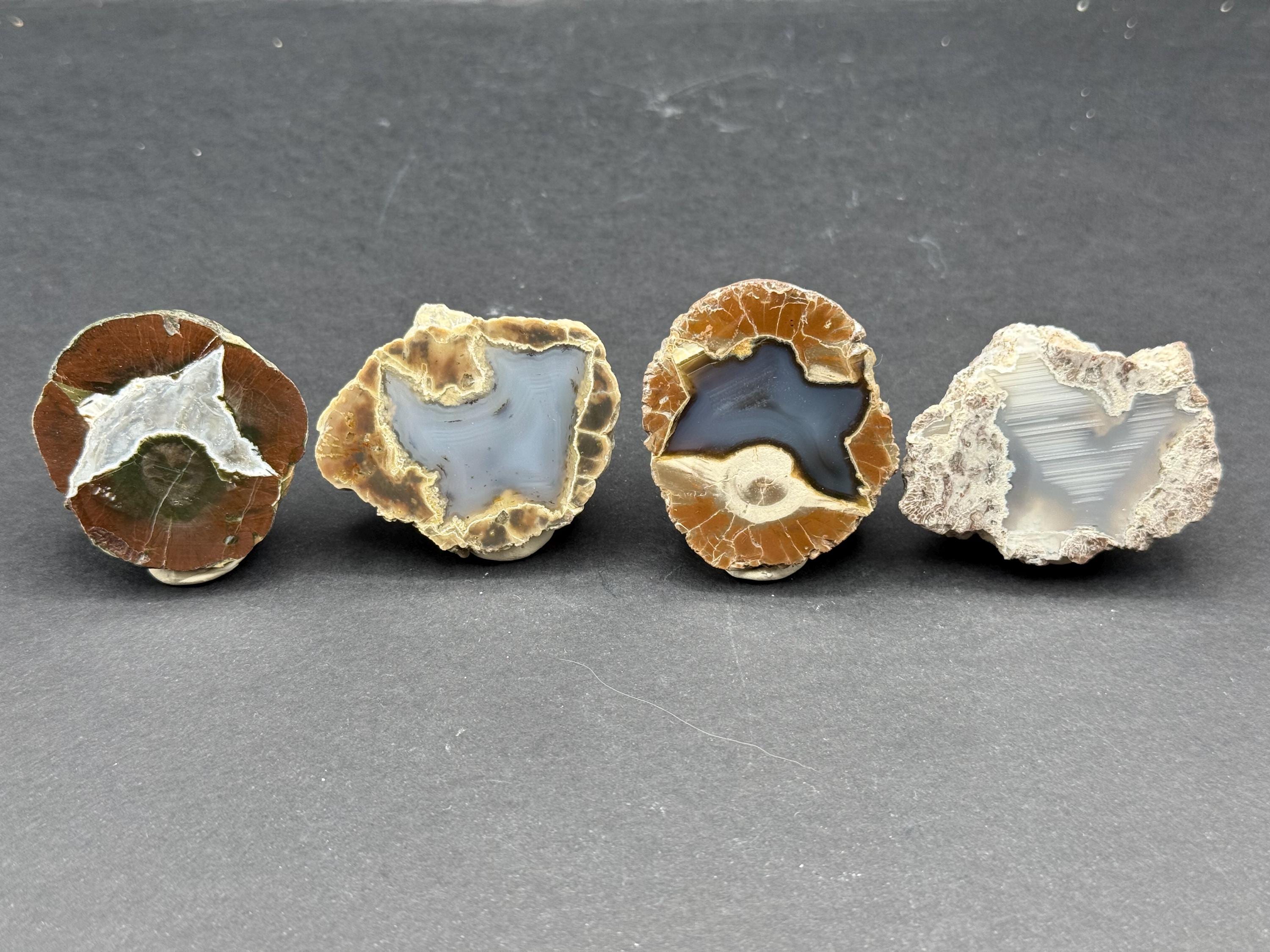 Included in this set: Secret Ridge — Blue/Gray agate with several denrites Richardson’s Ranch — Classic blue thunderegg Succor Creek — earthy, rugged shell around gray/blue core with water lines McDermitt — rich brown shell encasing a smooth white chalcedony center for a bold, high-contrast look.