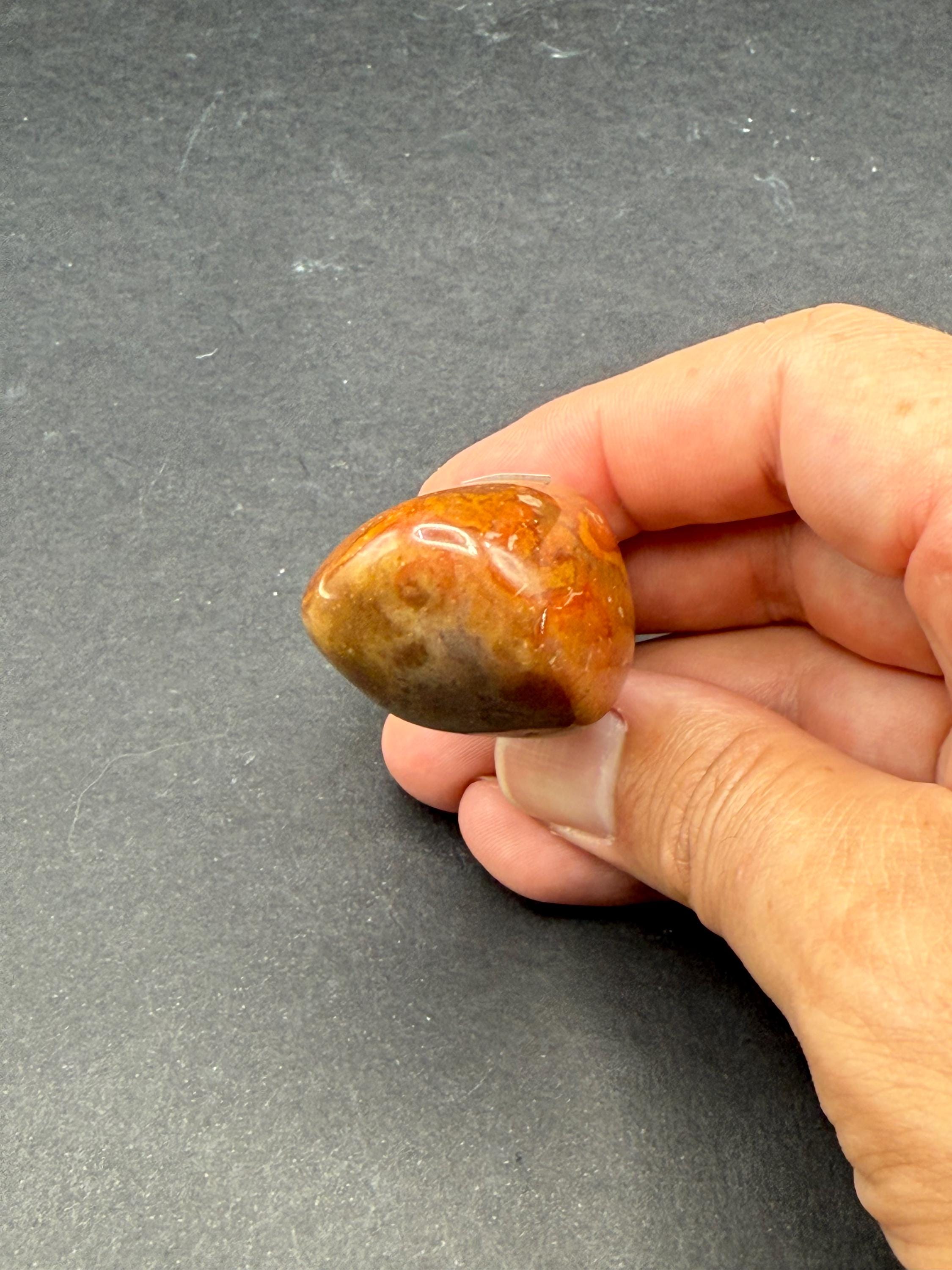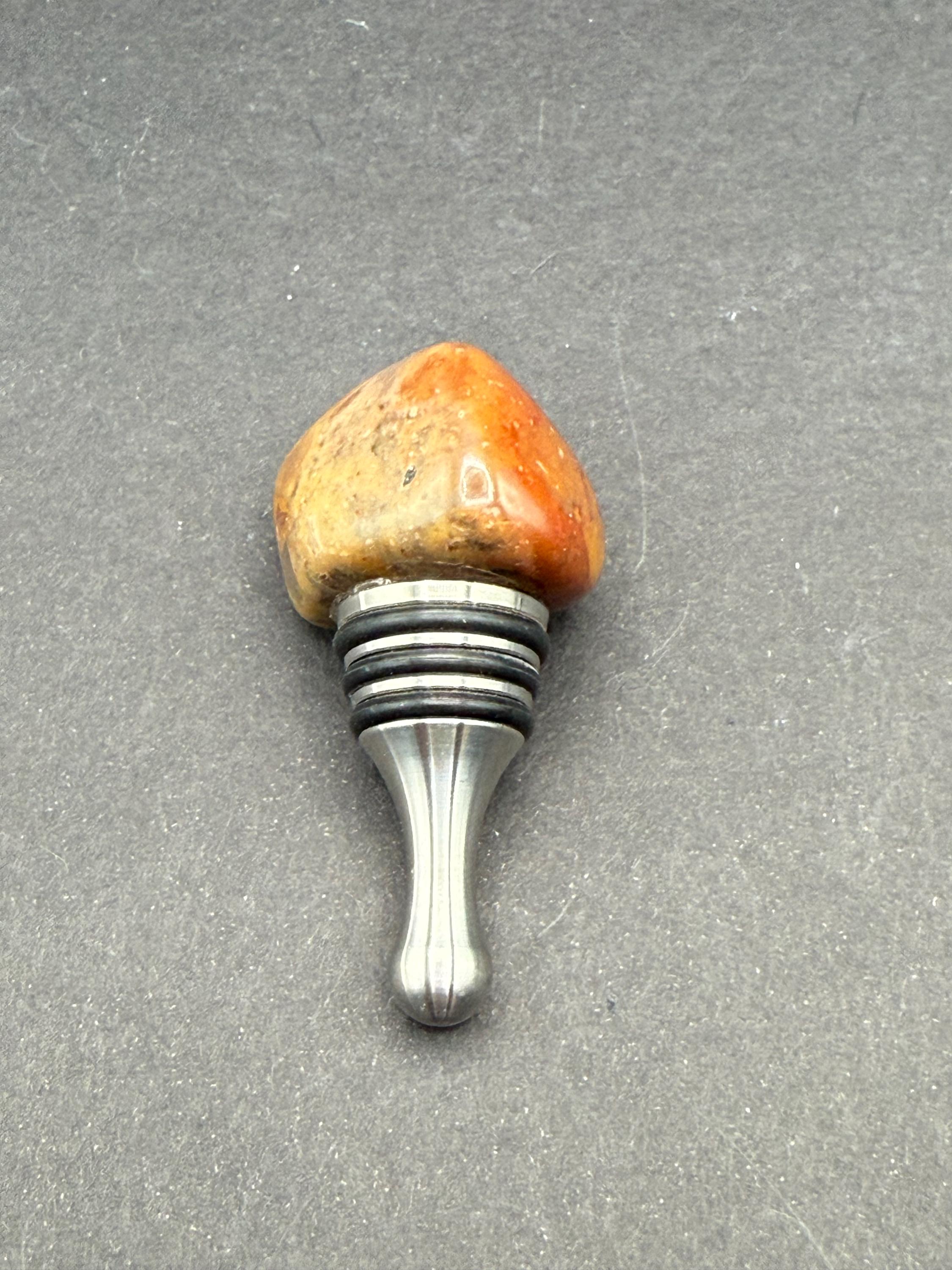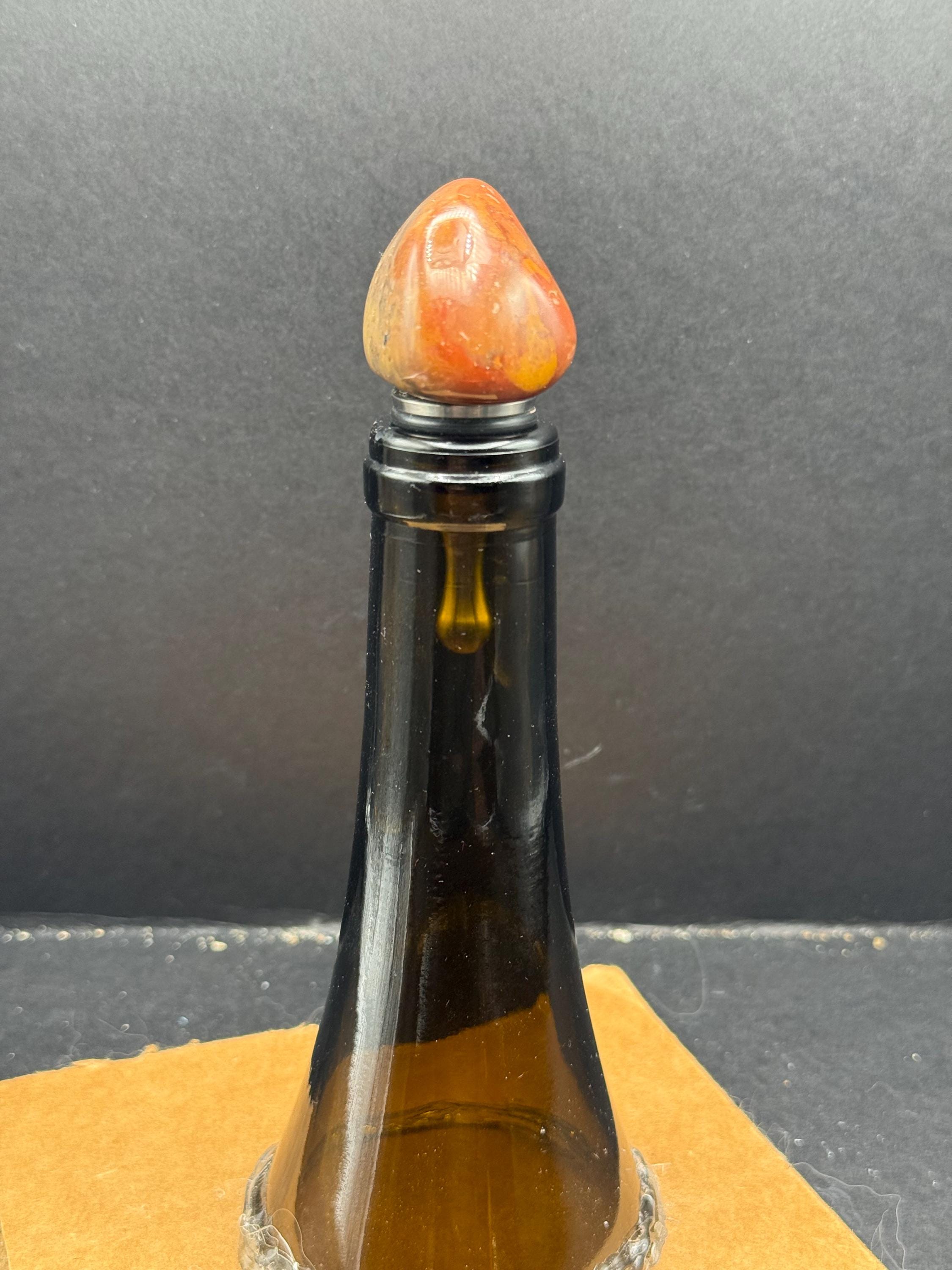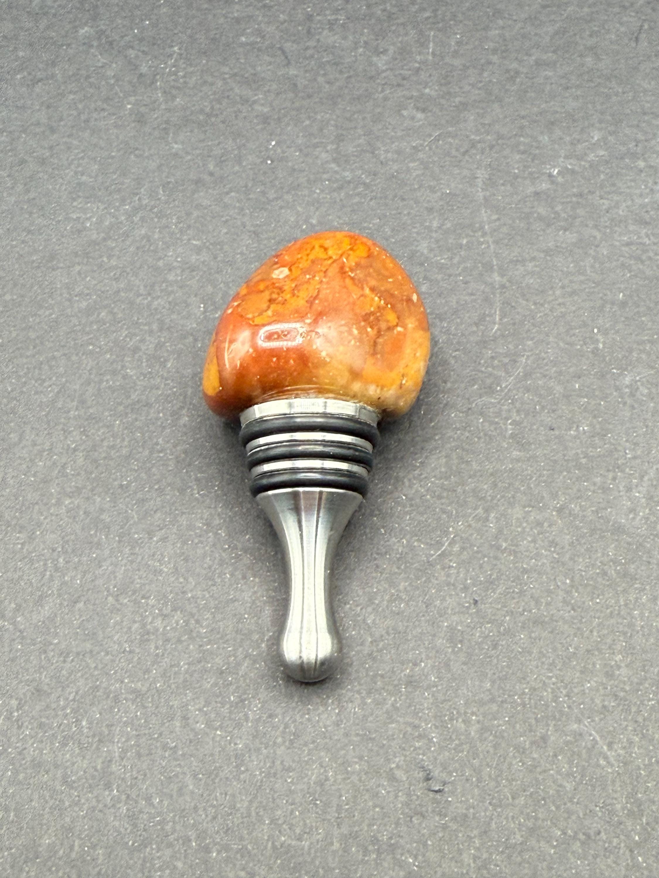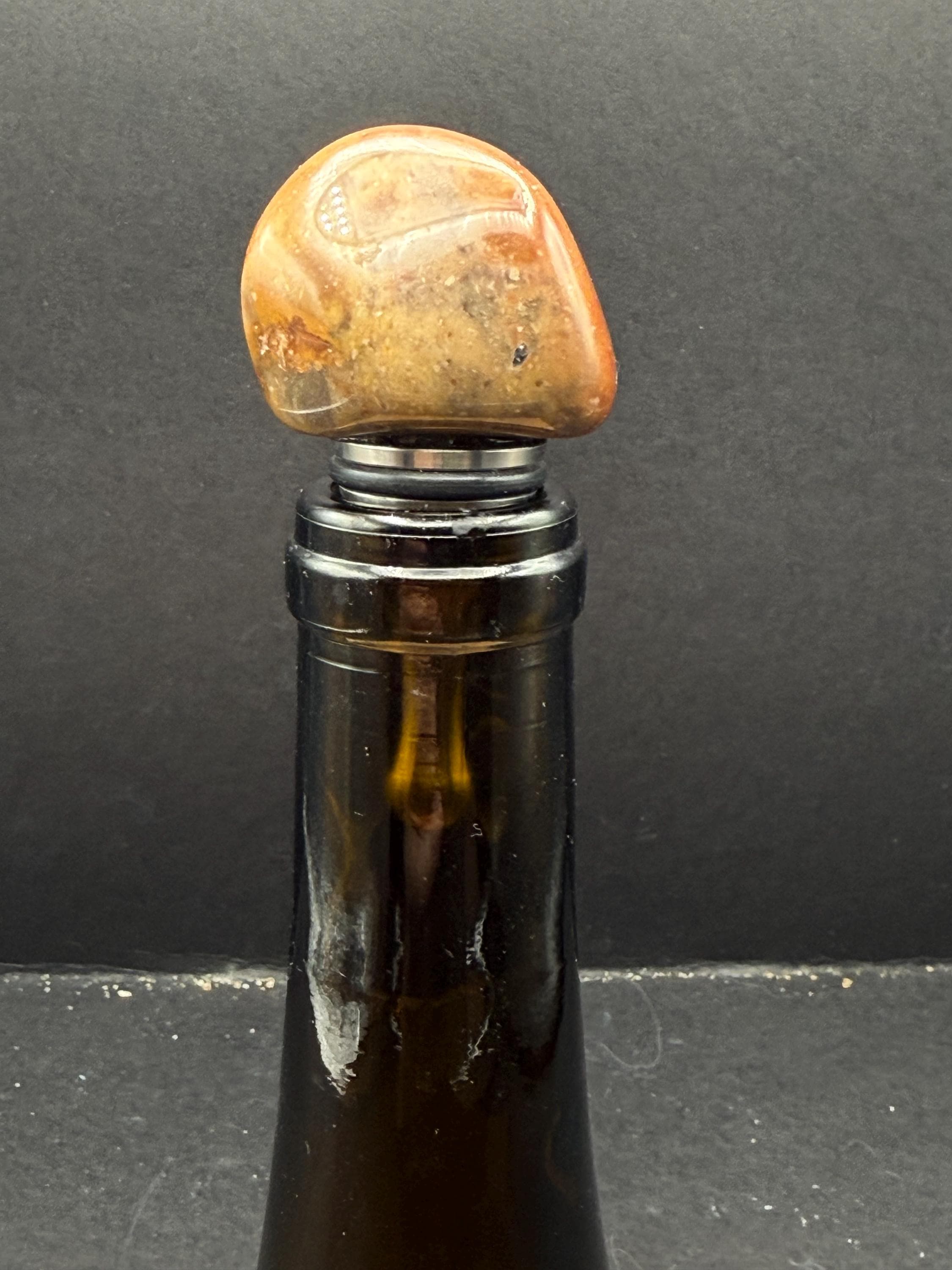 This unique wine bottle topper starts its story in Arizona’s beautiful Verde River and winery region, where we hand-collected this naturally vibrant stone during a rockhounding trip. Back in our shop, we tumbled and polished it to a smooth, glossy finish, revealing earthly reds, oranges, and tan patterns.